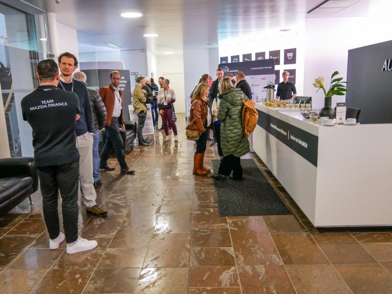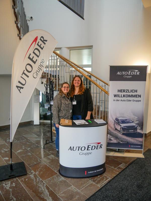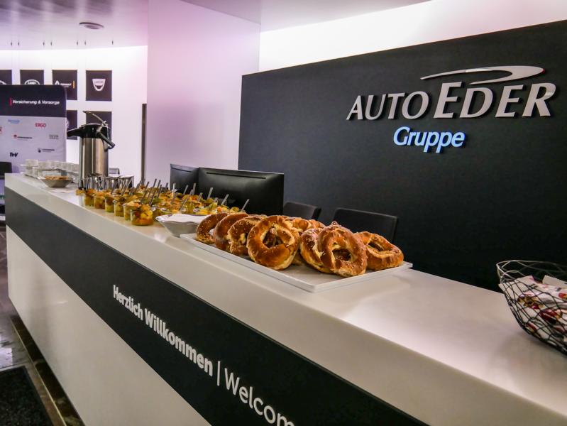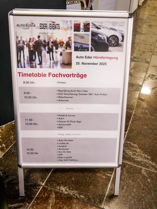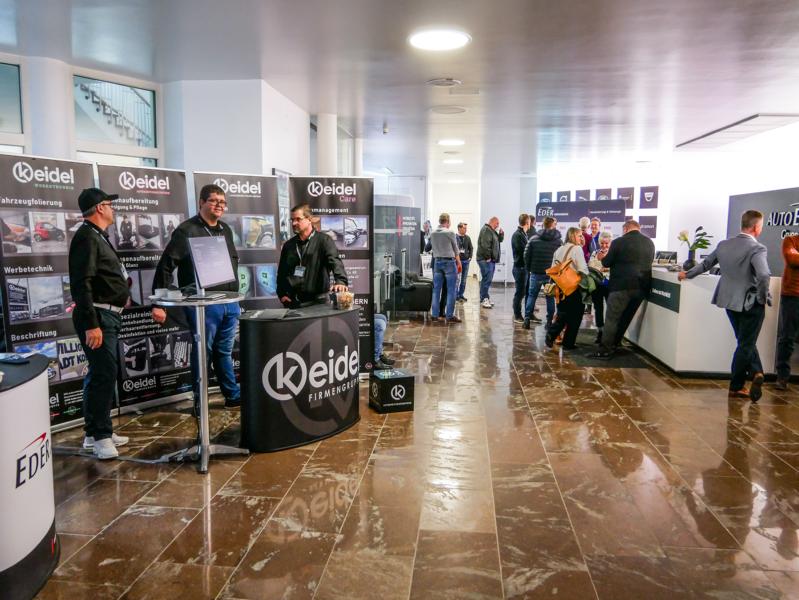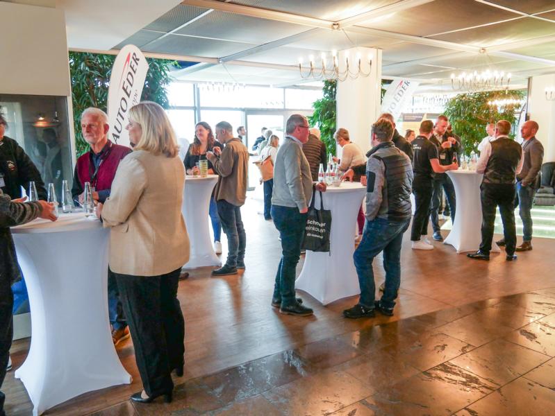 Schon beim Eintreffen der Gäste wurde deutlich, welchen Stellenwert diese Premiere im Kalender der Gruppe einnimmt: Kolleginnen und Kollegen aus der Zentrale begrüßten die Teilnehmenden persönlich, sorgten für einen reibungslosen Check-in und luden bei Kaffee und kleinen Snacks zu ersten Gesprächen ein. Messewände, Roll-Ups und Fahnen der Auto Eder Gruppe und ihrer Partner spannten im Hintergrund den inhaltlichen Bogen, von Versicherung und Schadenabwicklung über Gebrauchtwagenvermarktung bis hin zu Logistik und Werkstattbedarf. Messeplan und Timetable machten bereits am Eingang klar, wie vielfältig das Spektrum der präsentierten Leistungen ist.