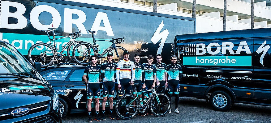 Bereits seit dem Jahre 2000 besteht die „Partnerschaft unter Profis“ zwischen dem deutschen UCI WorldTeam BORA-hansgrohe und Auto Eder Kolbermoor. Insgesamt 21 Ford Fahrzeuge stellt das Autohaus den Profis zur Verfügung – eine bunte Mischung bestehend aus Ford S-Max, Focus, Mondeo und Transit Custom, die auf alle Herausforderungen und Eventualitäten der Touren vorbereitet sind.